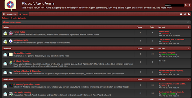 TMAFE is a Microsoft Agent community formed on May 25th, 2018. It primarily focuses on Microsoft Agent characters and their development. This website is also the official website for TMAFE software, which can be found on the Products page.